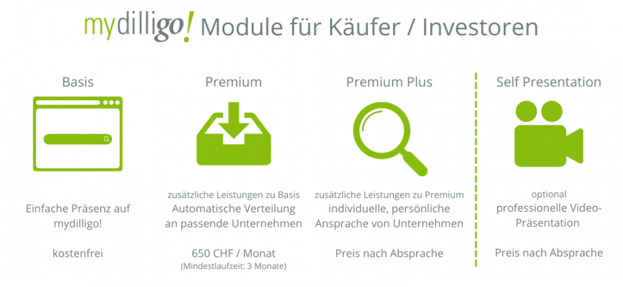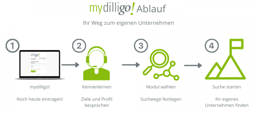 Auf diese Weise lernen Sie uns besser kennen. Gemeinsam besprechen wir die möglichen Abläufe für Ihre Unternehmenssuche und unterstützen Sie bei der Optimierung Ihres Auftritts auf mydilligo, um die Chancen auf gute Treffer für Sie zu maximieren!